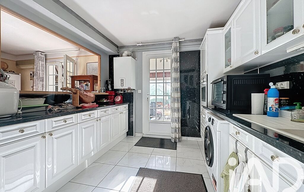La pièce de vie s’ouvre naturellement sur la véranda avec cuisine d’été, créant un espace fluide et convivial. La cuisine semi-ouverte structure l’ensemble avec harmonie.