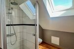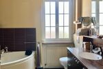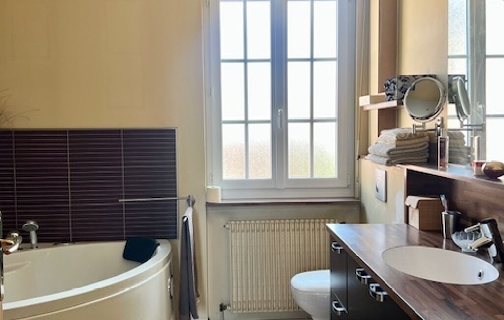 • 1er étage : deux chambres, dont une avec des placards et l’autre avec un dressing, tous deux de la marque Schmidt. Une salle de bain avec douche, baignoire et WC.