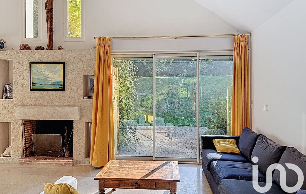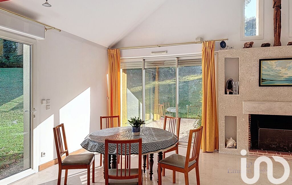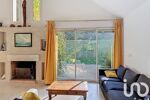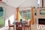 Le triple séjour avec plafond cathédrale et cheminée ouvre sur le parc grâce à de larges baies vitrées, créant une atmosphère chaleureuse et conviviale.