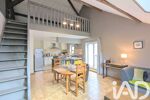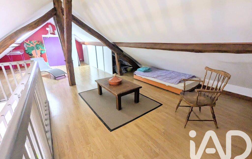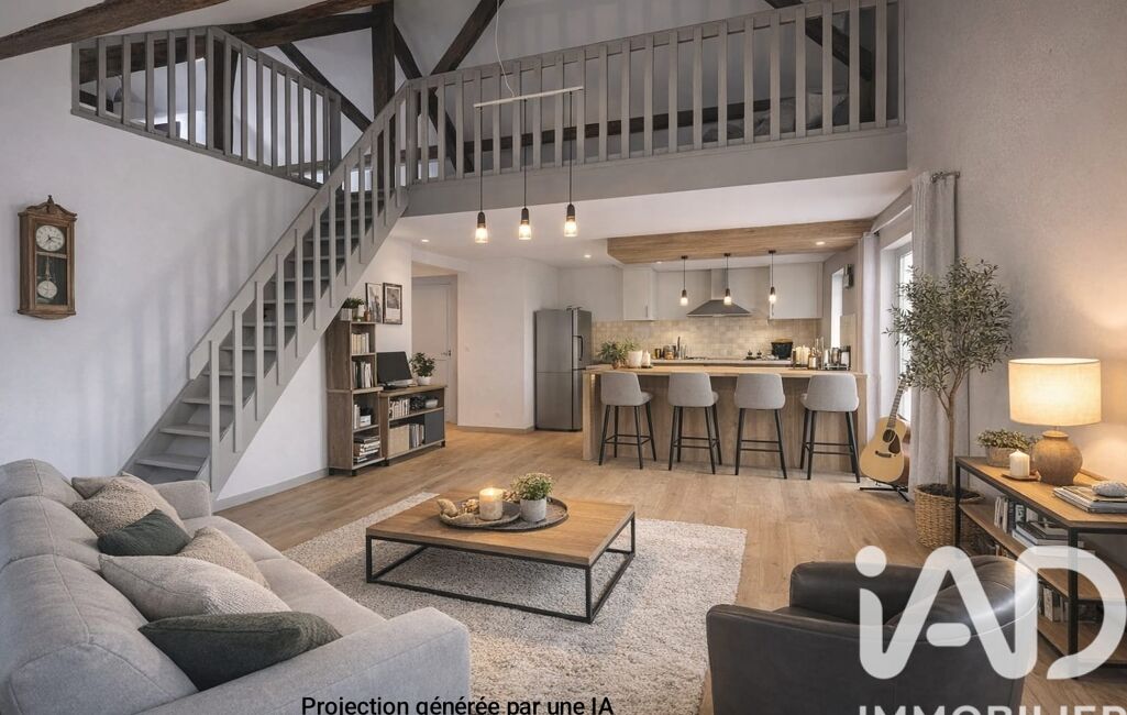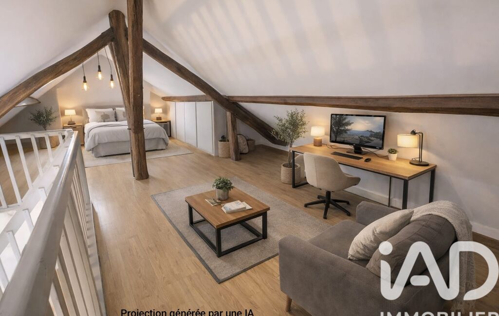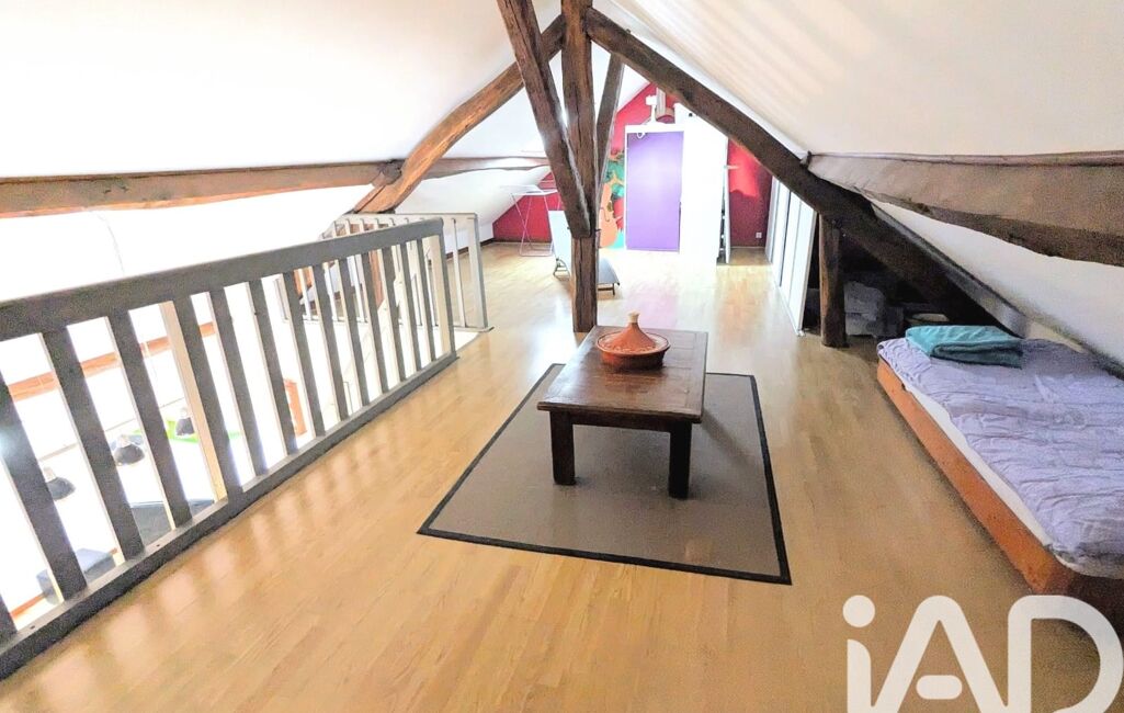 Un escalier intérieur conduit à une vaste mezzanine de 46 m² au sol, comprenant une deuxième chambre, offrant de beaux volumes et une atmosphère cosy sublimée par les poutres apparentes, véritables témoins du caractère atypique des lieux.
