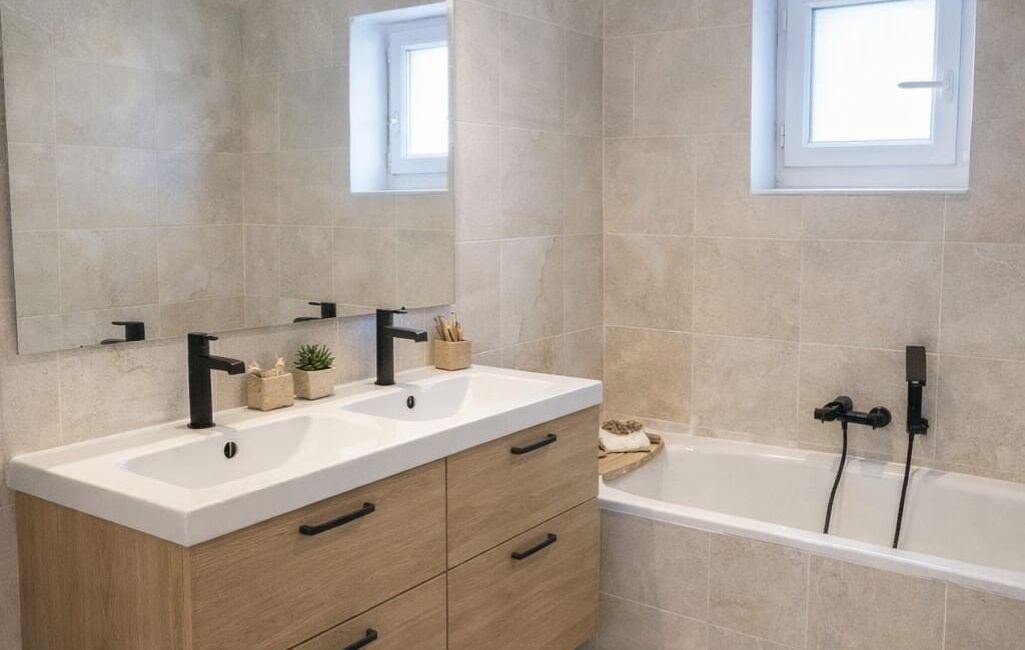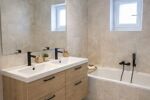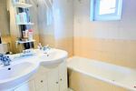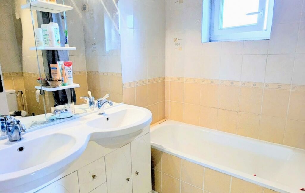 L’entrée s’ouvre sur un couloir desservant une belle chambre de 15 m², dotée de placards intégrés, ainsi qu’une salle de bains équipée d’une double vasque, d’une baignoire et de WC.