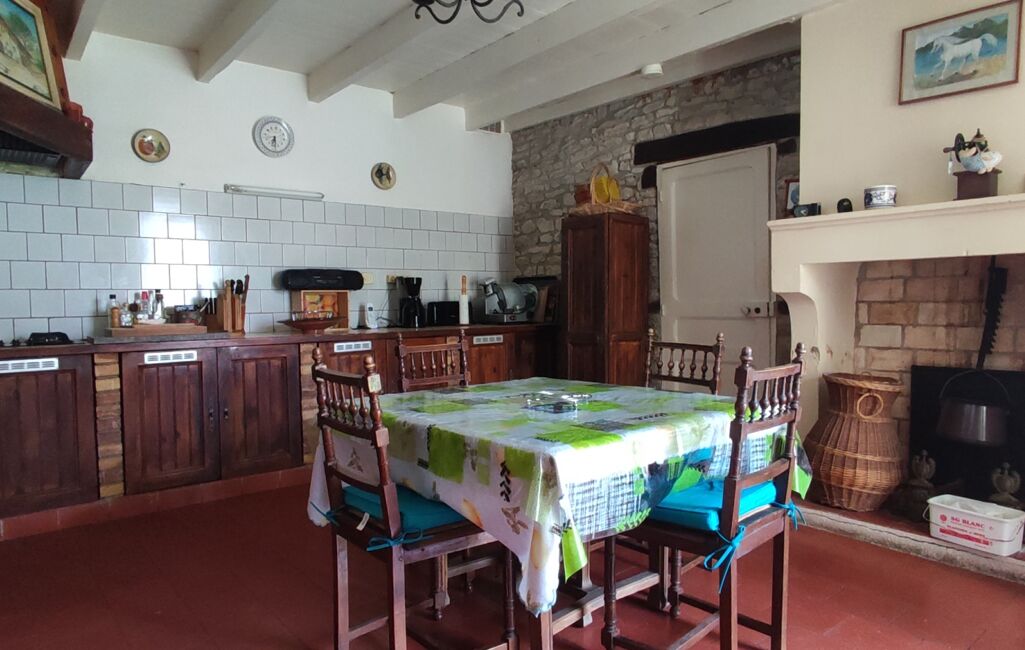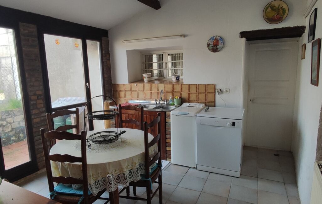Deuxième partie : une arrière cuisine avec courette, une salle à manger avec cuisine équipée/aménagée et une cheminée ouverte.