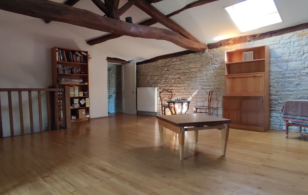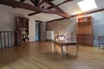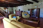 Un grand salon/séjour d'environ 45m2 plein de charme avec ses poutres apparentes et sa cheminée ouverte, idéal pour recevoir, avec accès direct au jardinet.