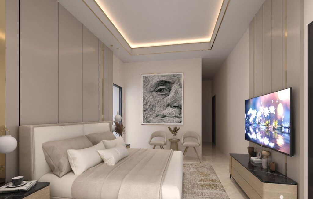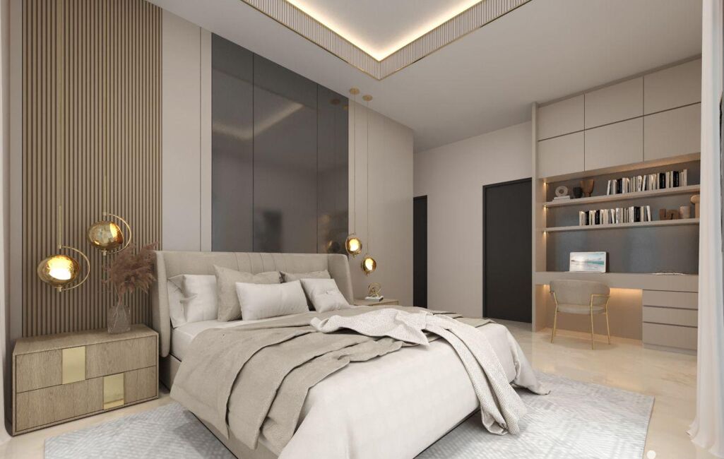 Grand séjour lumineux de 70 m² environ, 5 chambres, chacune avec sa salle de bains et son dressing, cellier, buanderie, domotique, climatisation réversible, panneaux solaires, alarme, vidéosurveillance…