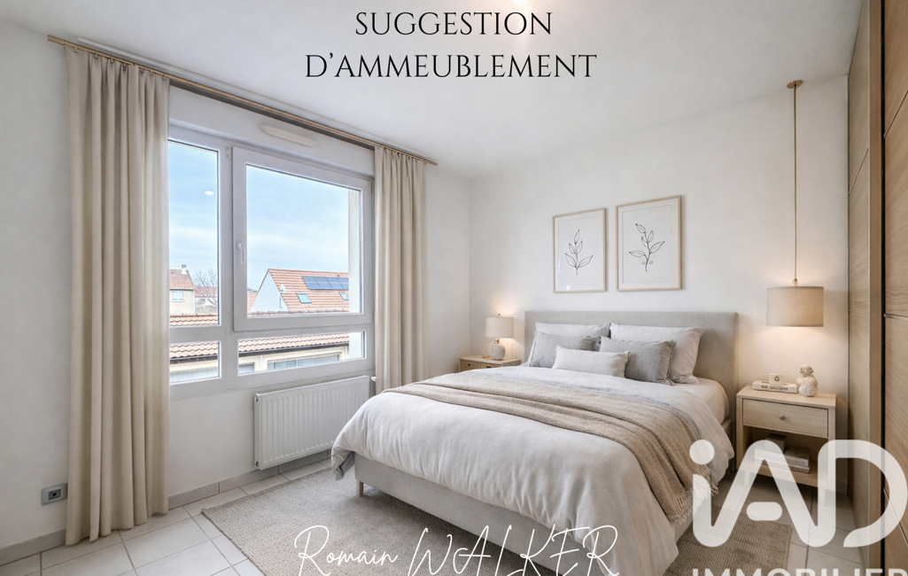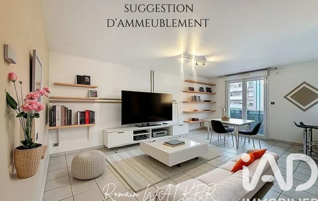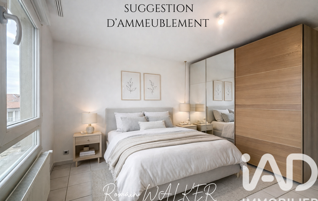 iad France - Romain Walker vous propose: EXCLUSIVITÉ – Appartement F3 avec balcon, garage et cave – Accès gare immédiat – Idéal frontalier - Les photos 1, 8, 11 et 13 présentent des suggestions d’aménagement intérieur.