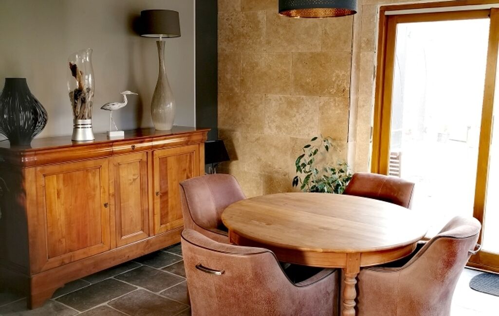 • Beau séjour lumineux avec matériaux de qualités, pierre bleu et travertin.