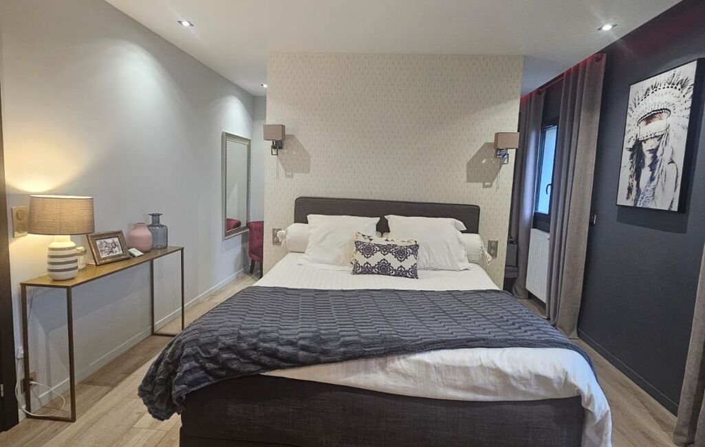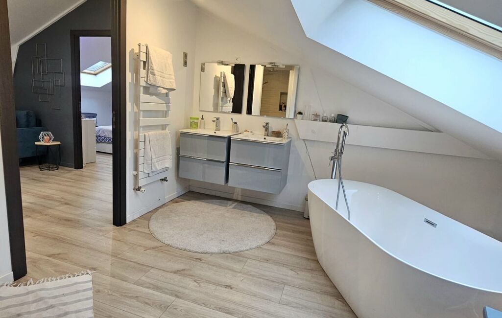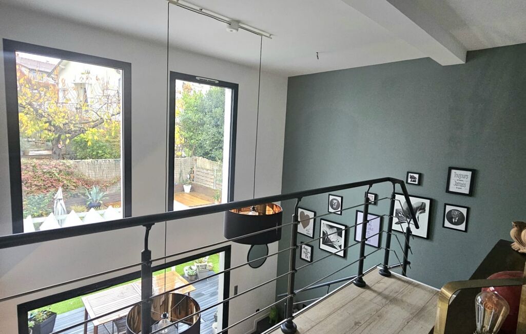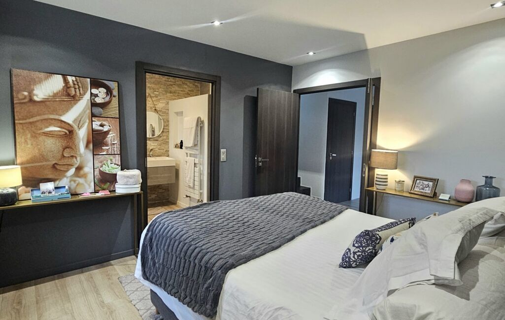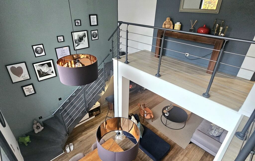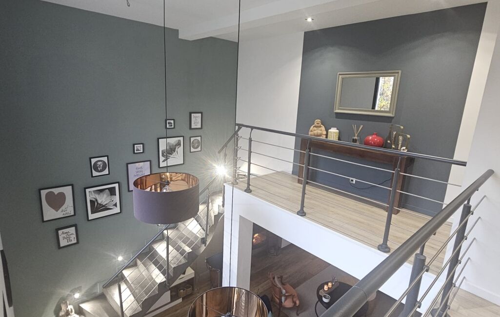 À l’étage, une élégante mezzanine dessert une superbe suite parentale comprenant une grande chambre, un dressing aménagé et une salle de bain raffinée avec baignoire et douche à l’italienne. Une buanderie, un bureau idéal pour le télétravail et un WC indépendant viennent compléter cet espace pensé pour la tranquillité et la praticité.
