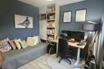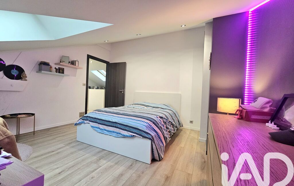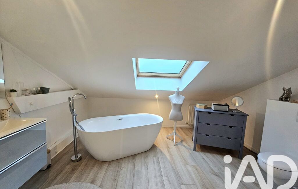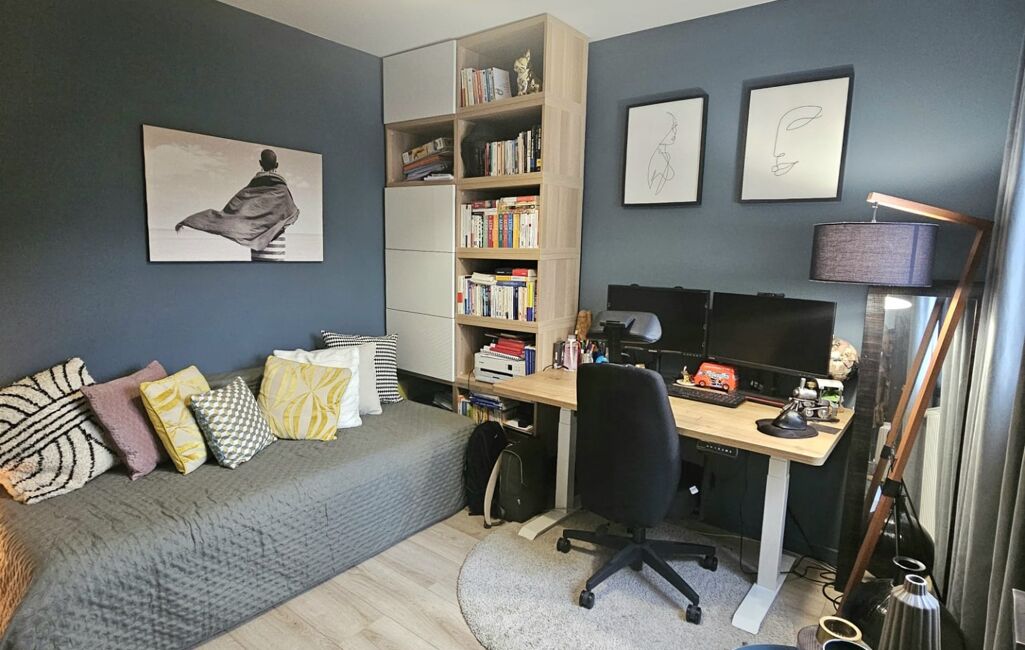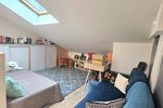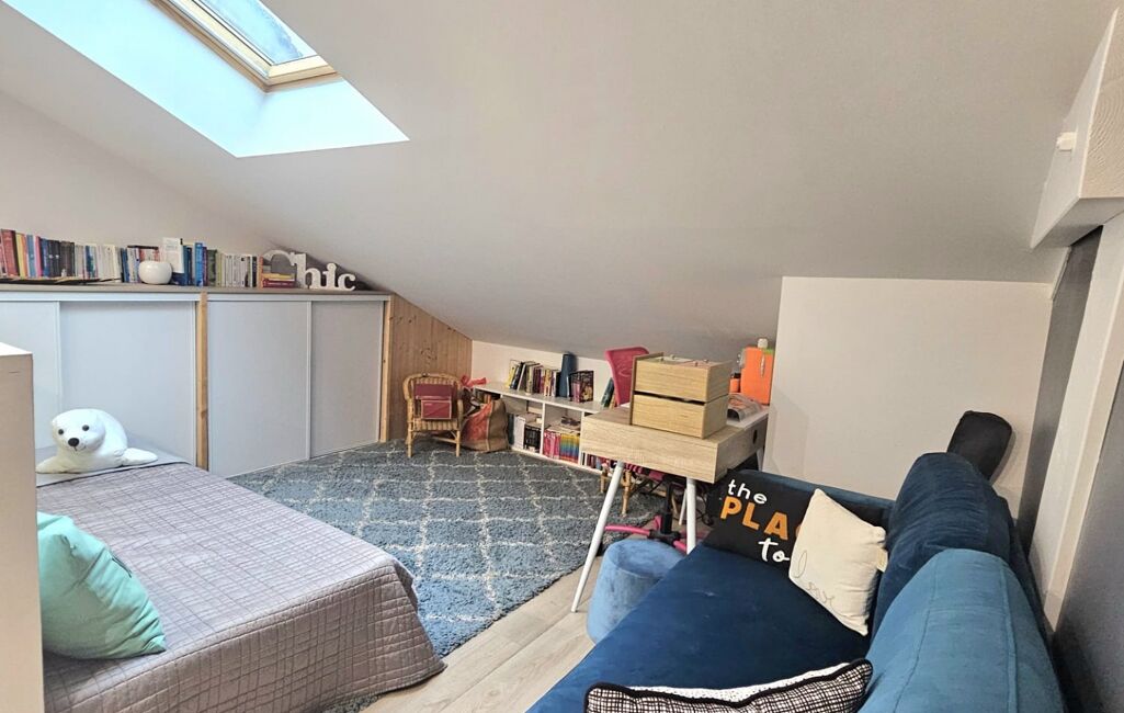 Le deuxième étage offre deux grandes chambres ainsi qu’un vaste espace aujourd’hui aménagé en coin lecture, pouvant aisément être transformé en chambre supplémentaire selon les besoins. Une salle de bain moderne, équipée d’une baignoire, d’une double vasque et d’une douche à l’italienne, complète cet étage dédié aux enfants ou aux invités.