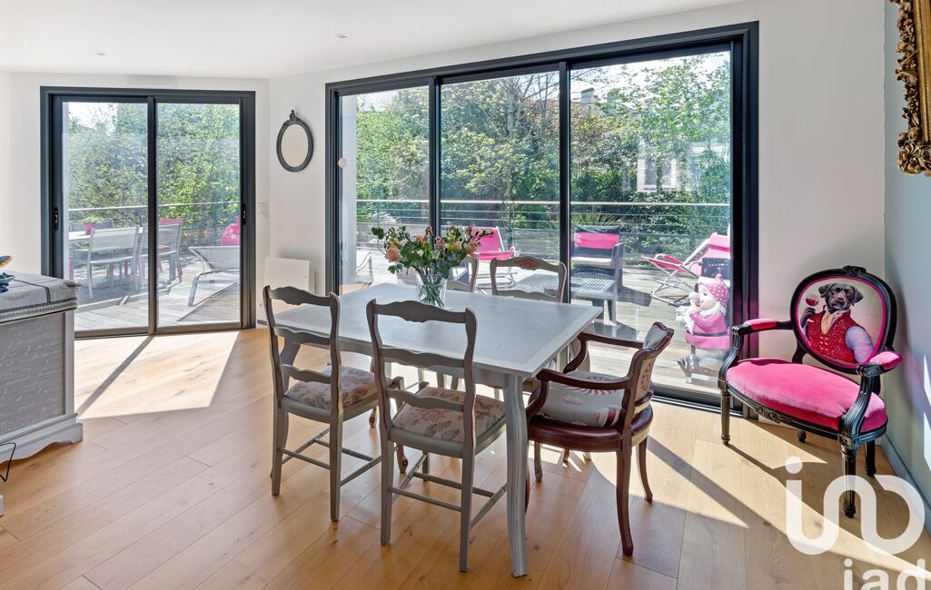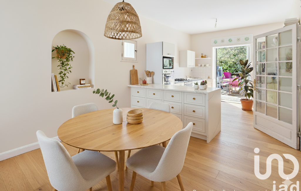 La maison s’ouvre sur une entrée qui dessert le séjour et la cuisine. Le séjour est très agréable grâce à ses nombreuses ouvertures et sa lumière traversante. Son parquet et sa cheminée le rendent très chaleureux. La cuisine de 23 m² offre un bel espace repas avec une charmante fenêtre d'angle. Ces deux pièces bénéficient d'un accès direct à la terrasse de 48 m² qui surplombe le jardin clos exposé sud-ouest, arboré et sans vis-à-vis.