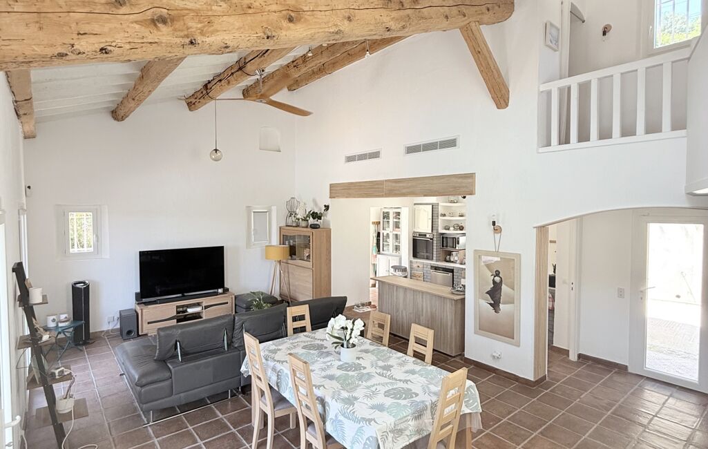 La pièce principale d’environ 50 m² comprend un séjour cathédrale avec poutres apparentes et une cuisine ouverte. La hauteur sous plafond de 5 mètres apporte volume et lumière.