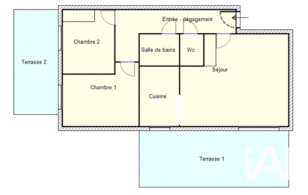 Il se compose d’une entrée, d’un bel espace de vie avec une terrasse de 15m² exposée OUEST où vous pourrez profiter de vos repas en extérieur. Une cuisine entièrement équipée et aménagée pouvant s’ouvrir sur le séjour. Deux chambres de 10 et 11m² avec placards intégrés dont l'une donnant sur une seconde terrasse de 9m². Une salle d’eau et des toilettes séparées.