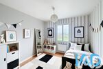 La baie vitrée équipée d'un volet roulant électrique apporte une belle luminosité et donne accès directe à la terrasse en bois de 30 m², idéale pour les repas et les moments de détente.