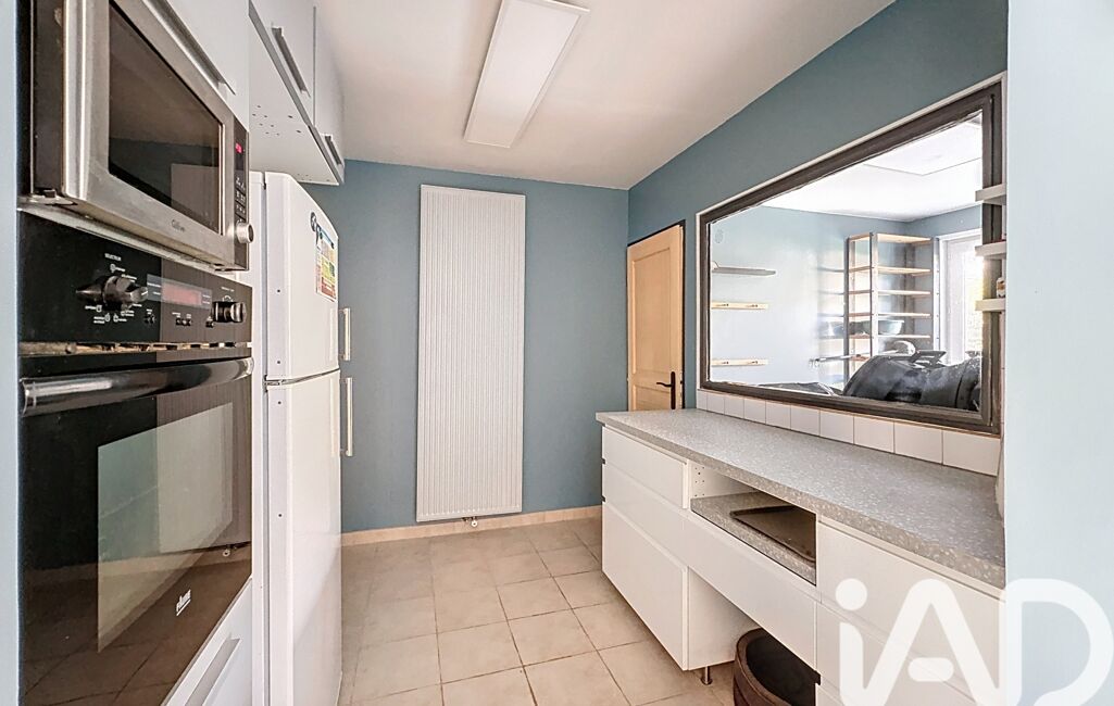 La cuisine semi-ouverte, séparée par une verrière, est élégante et fonctionnelle. Elle se prolonge par une arrière-cuisine astucieuse offrant de nombreux rangements et un accès direct au garage double et au jardin.
