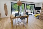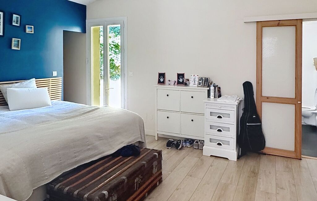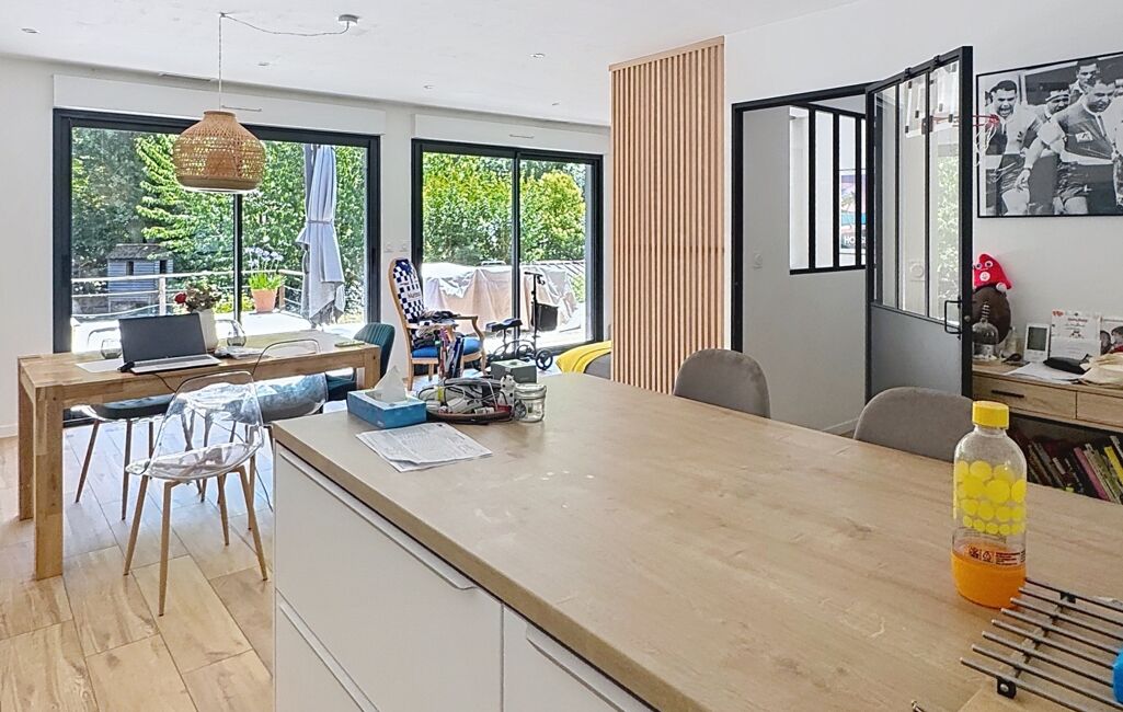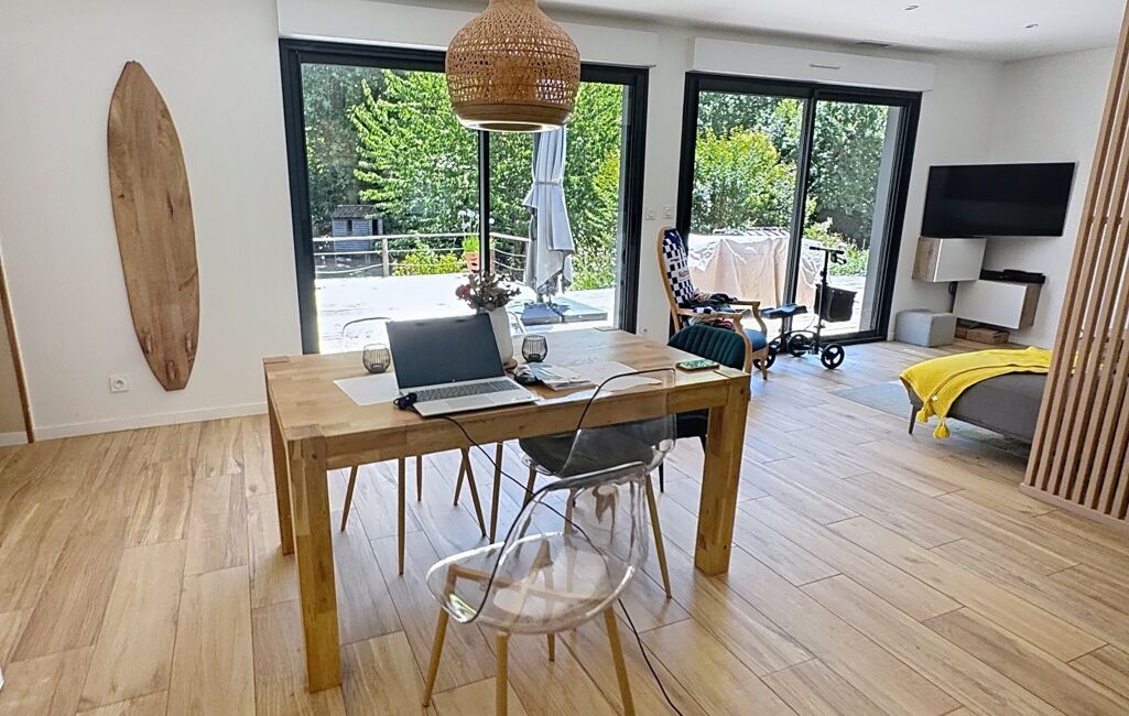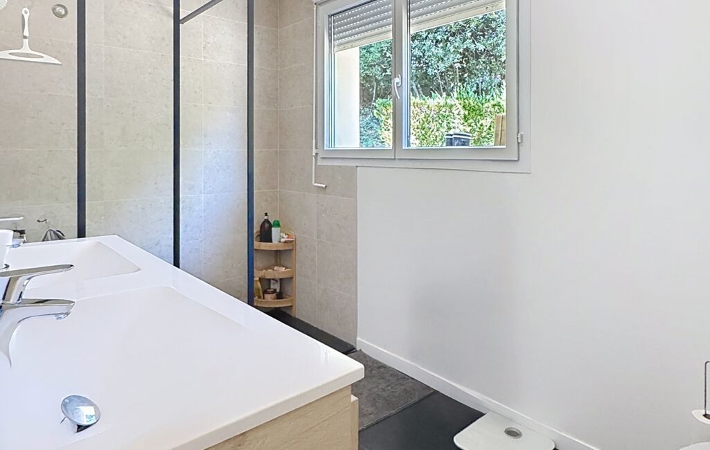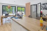L’entrée dessert un vaste séjour très lumineux, ouvert de plain-pied sur la terrasse et le jardin, ainsi qu’une cuisine ouverte parfaitement intégrée à l’espace de vie. La partie nuit est composée de trois chambres avec une salle de bains, d’une suite parentale avec sa salle d’eau privative et d'une buanderie.