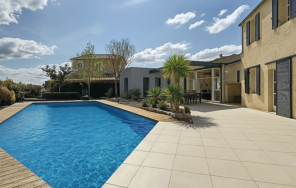À l’extérieur, l’aménagement a été pensé pour profiter pleinement du climat méditerranéen : jardin paysagé sans vis-à-vis, piscine chauffée, cuisine d’été et terrasse avec pergola bioclimatique.
