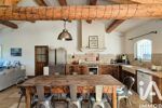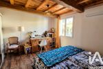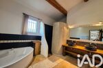 Principalement de plain-pied, la maison s’organise autour d’une pièce de vie cathédrale d’environ 75 m², lumineuse et aux volumes remarquables, comprenant un double séjour, une salle à manger et une cuisine ouverte. Les matériaux confèrent à l’ensemble un cachet authentique, avec travertin au sol, poutres apparentes en bois massif, menuiseries en bois et éléments en fer forgé.