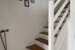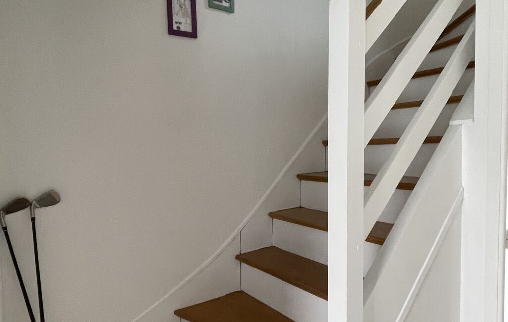 À l’étage, l’escalier en bois dessert :