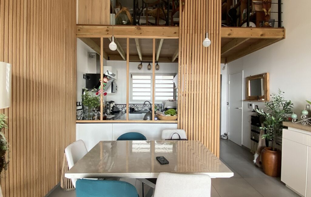 L'appartement se compose d'un séjour lumineux , d'une cuisine moderne et de qualité , d'une petite mezzanine aménagée en bureau, de