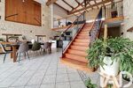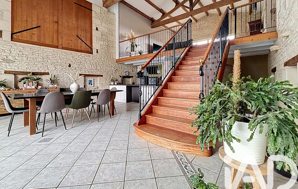 La maison principale, développant environ 270 m², offre une atmosphère chaleureuse et authentique, sublimée par une hauteur sous plafond remarquable et le cachet de l’ancien. La pièce de vie, spacieuse et lumineuse, s’organise autour d’un magnifique escalier en bois, véritable pièce maîtresse de la maison, avec sa rambarde en fer forgé qui souligne le caractère unique des lieux.