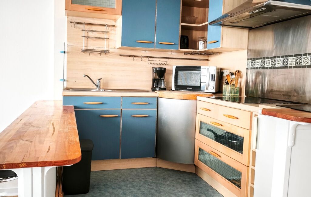 La cuisine ouverte, aménagée et équipée, s’intègre harmonieusement à l’ensemble et permet de profiter pleinement de l’espace au quotidien.