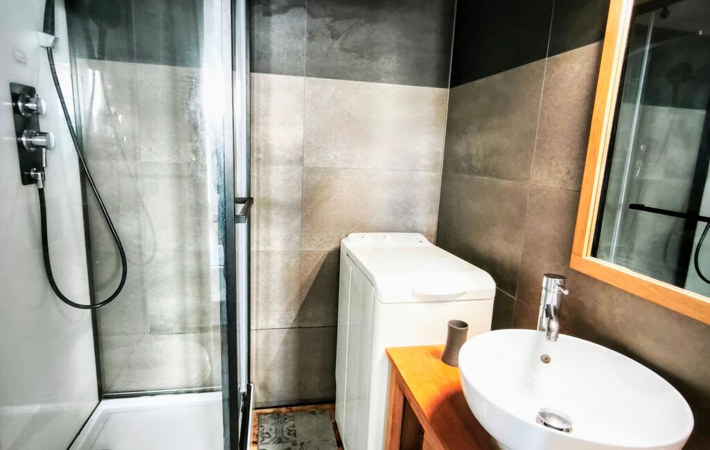 La salle d’eau moderne comprend une douche, un lavabo ainsi qu’un espace dédié pour une machine à laver, alliant confort et praticité.