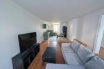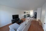 L’appartement se compose d’un vaste séjour lumineux avec canapé d’angle, télévision et espace repas, ouvert sur une cuisine entièrement équipée (plaques, four, hotte, réfrigérateur, micro-ondes).