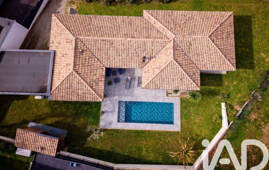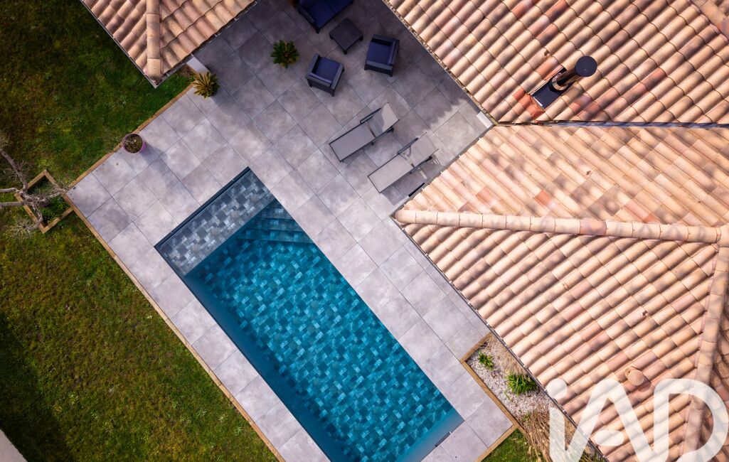 Face au séjour, la piscine miroir avec volet roulant immergé vient sublimer l’ensemble . Son effet visuel épuré prolonge les lignes de la maison et offre un spectacle permanent depuis la pièce de vie. L’été, les baies vitrées s’ouvrent et l’espace devient une véritable continuité entre la terrasse, l’eau et le salon, et l'espace pool house avec son barbecue.