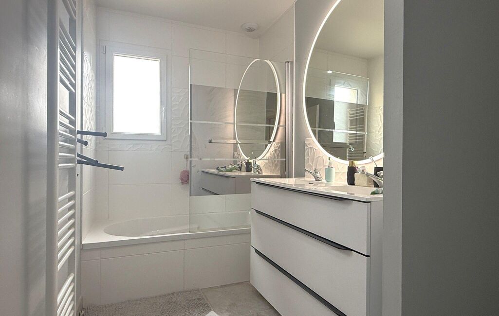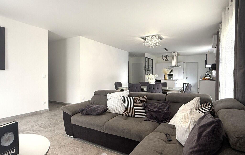 Hall d'entrée, pièce de vie d'environ 49 m2 comprenant une cuisine ouverte façon US aménagée-équipée et salon-salle à manger, 3 chambres dont 2 équipées de placards et 1 suite parentale avec salle d'eau / dressing, salle de bains avec double vasque, WC séparé, cellier (4,82 m2). Terrasse avec pergola bioclimatique, garage (17 m2).