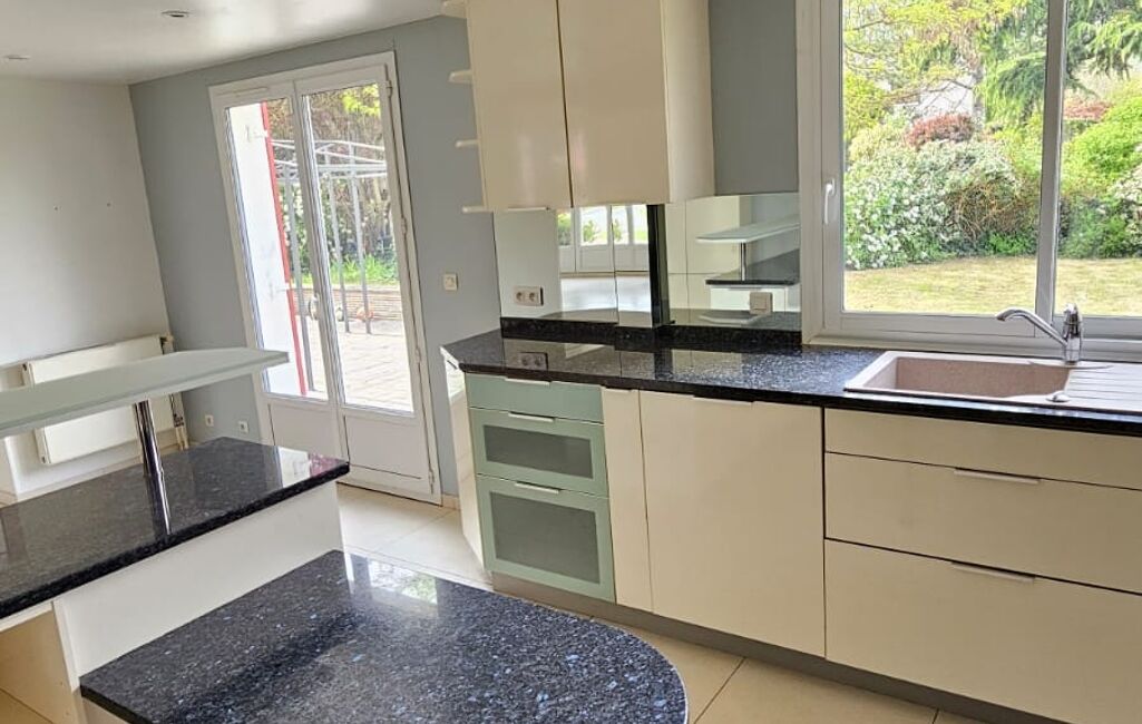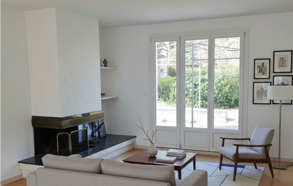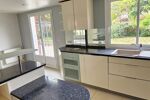 En rez-de-jardin, une entrée dotée d’une penderie et de toilettes invités dessert un vaste séjour traversant Est-Ouest avec cheminée sur lequel donne une cuisine ouverte et son espace repas. Une chambre de plain-pied ainsi qu’un bureau ou dressing, une salle de douche peuvent accueillir des amis de passage.
