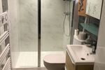 Une salle d’eau moderne avec douche et WC.