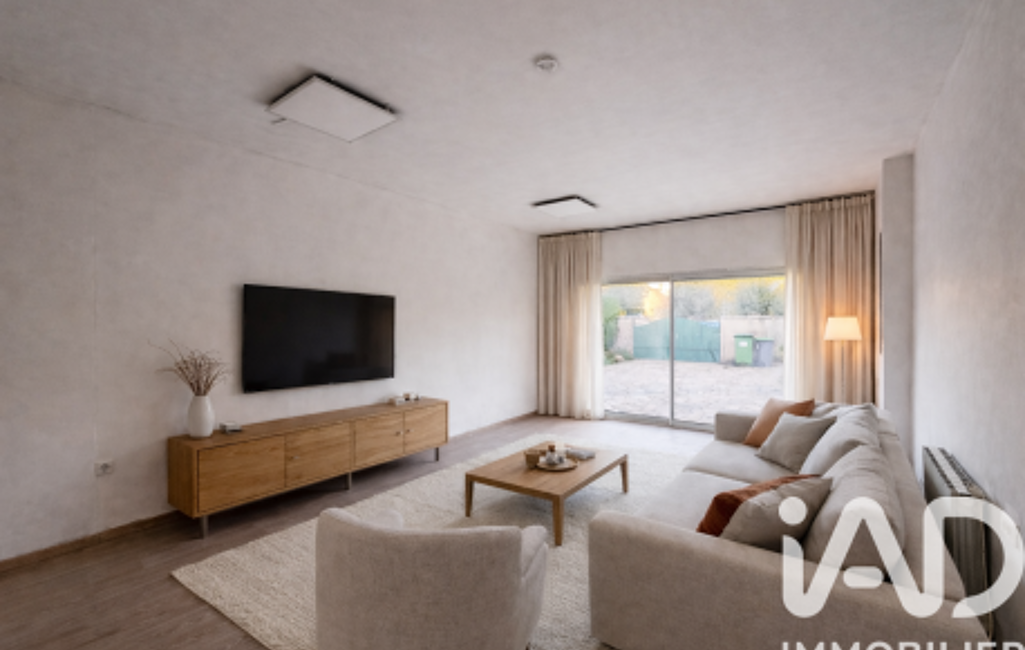 Un garage réhabilité en salon de 24m² avec un espace à aménager en dressing ou buanderie.