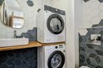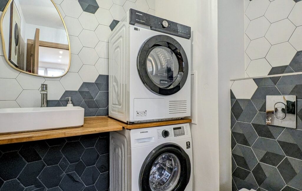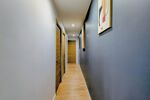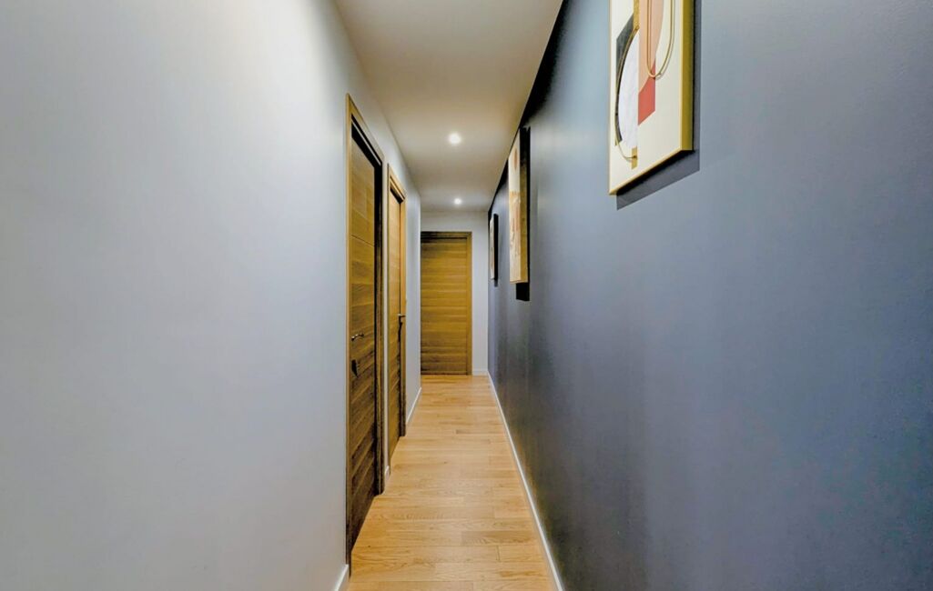 Un couloir dessert les trois chambres et la salle de bain moderne. Vous trouverez également un WC indépendant avec lave-mains et espace buanderie pour plus de praticité.