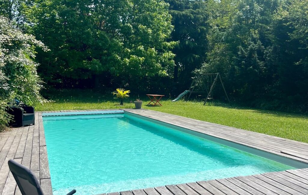 La piscine 12x4 au sel, avec sa plage en bois et son volet motorisé, promet de beaux moments de partage aux beaux jours.