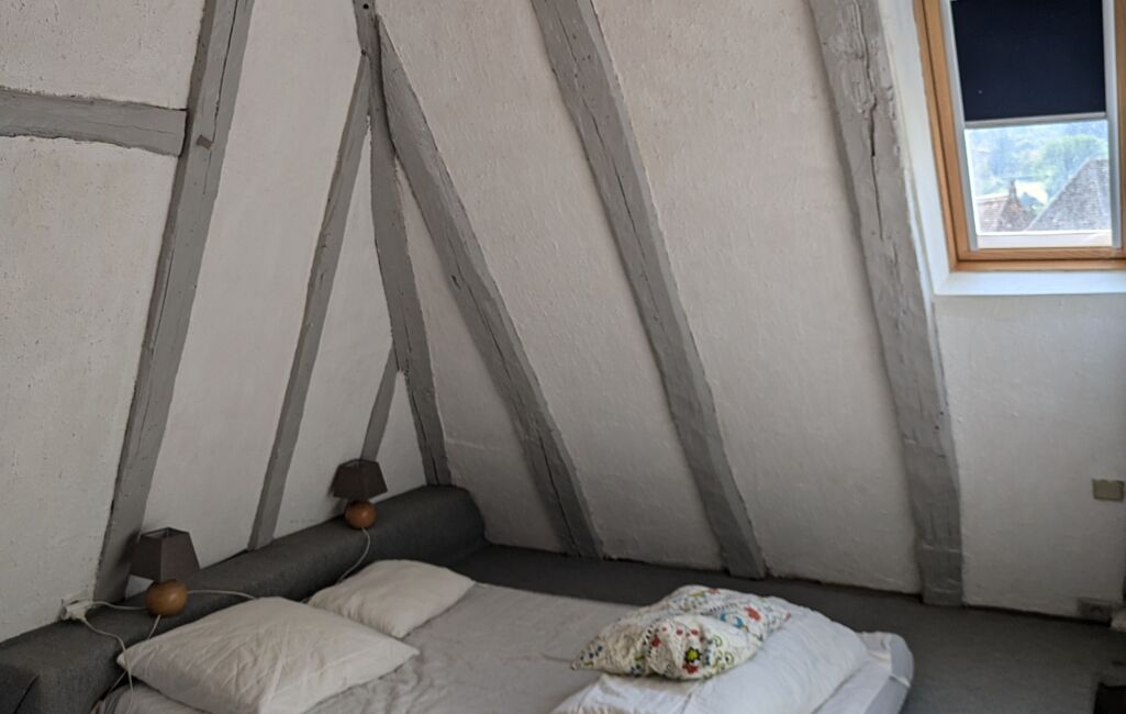 Un escalier extérieur mène à l'étage qui offre une chaleureuse pièce à vivre de 26 m2 avec cuisine - pierre et poutres apparentes, parquet ancien. Au second étage : un palier de 11m2 dessert une chambre de 9,4 m2 et une salle de bain de 5 m2. Au 3ème étage : deux chambres sous comble de 5 m2 en loi carrez (surface plancher : 7 m2) et 8 m2 (surface plancher : 15 m2).