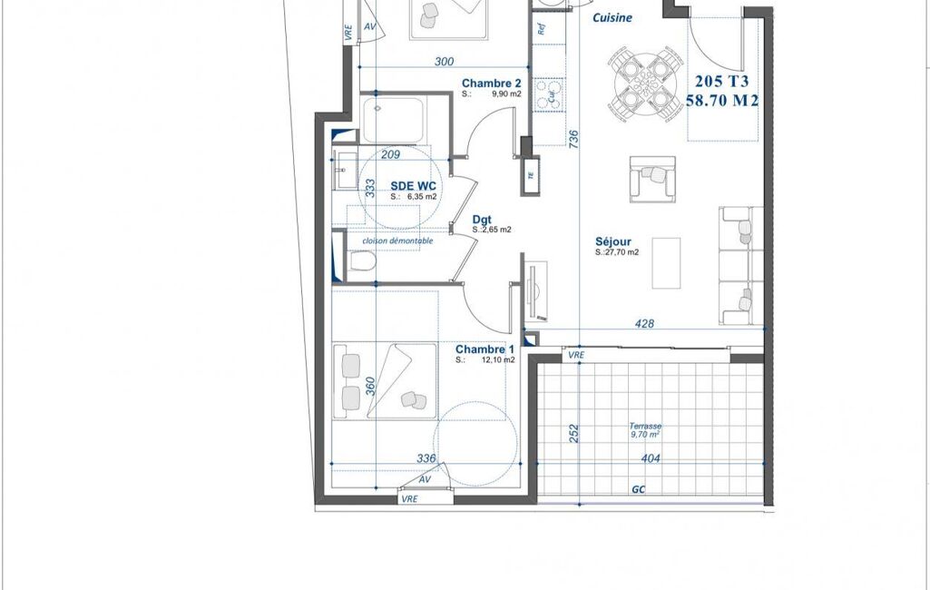 - Surface habitable : 58 m²