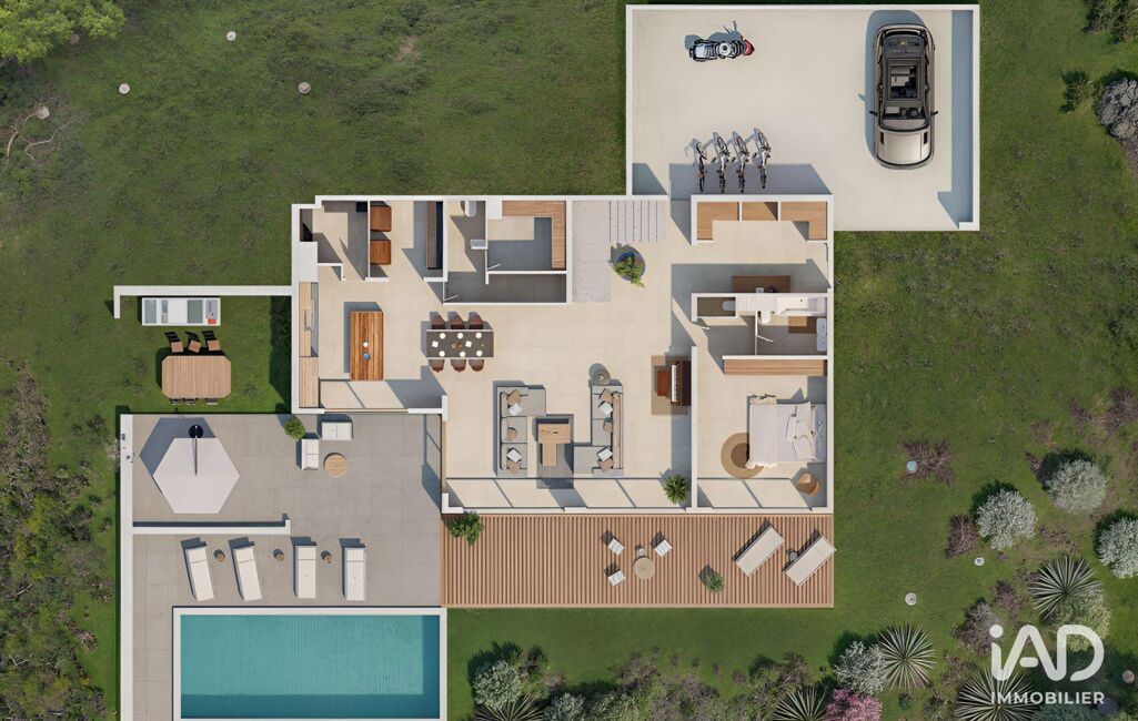 Les espaces de vie se prolongent naturellement vers les terrasses et la piscine, créant une continuité intérieur-extérieur idéale pour une vie tournée vers le climat méditerranéen. La cuisine indépendante, aux dimensions généreuses, est complétée par un cellier, une buanderie et une cave à vin dédiée.