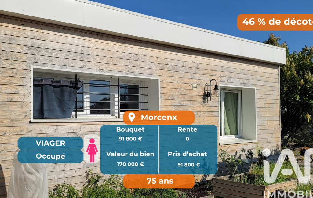 viager occupé à bouquet intégral, sans rente mensuelle : 91 800 € le jour de la signature chez le notaire. La crédirentière, âgée de 75 ans, conserve son Droit d'Usage et d'Habitation (DUH) jusqu'à son décès. L'investissement est connu et maîtrisé dès le premier jour.