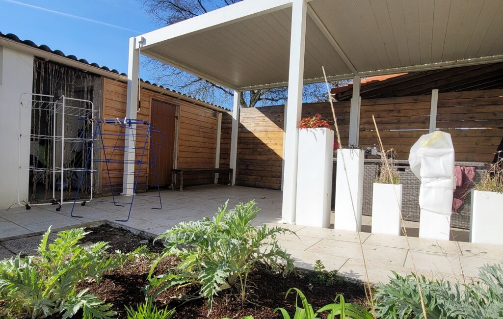 La maison se compose de 2 chambres, séjour, bureau, cuisine et SDE avec WC, le tout de plain-pied . À l'extérieur, une belle terrasse et dépendance de 15 m2 s'ouvrent sur un jardin clos et arboré. Parcelle de 612 M2. Façade bardage bois.