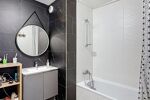 •Une salle de bains moderne avec meuble vasque, miroir, VMC et sèche-serviettes.
