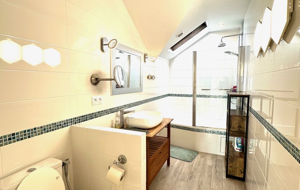 À l’étage, vous découvrirez trois grandes chambres, dont une avec vaste dressing, une salle de bain avec baignoire et WC, ainsi qu’un espace bureau ou salle de jeux.
