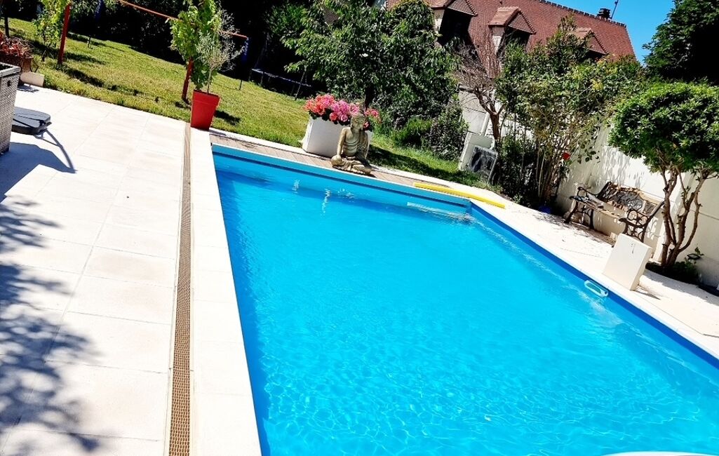À l’extérieur, un magnifique jardin paysager, agrémenté d’arbres fruitiers, une terrasse et une piscine chauffée (2020) avec volet électrique et éclairage, offrent un cadre de vie rare et privilégié.