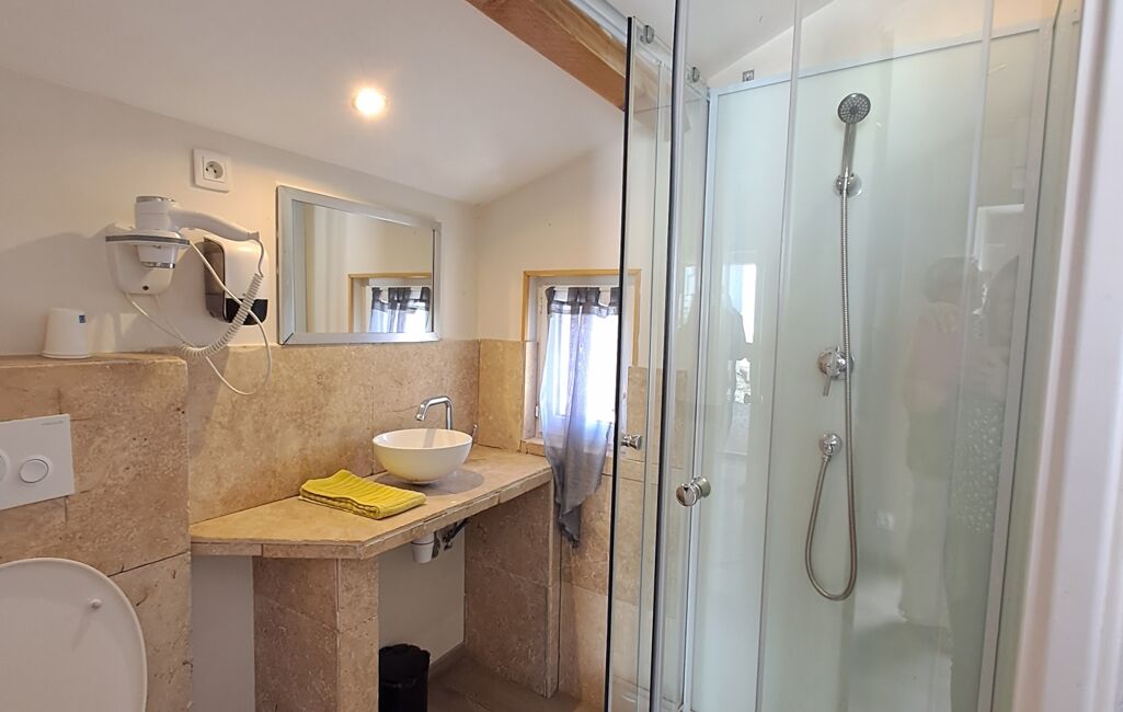 En sortant du restaurant, vous découvrirez une chambre PMR de 24 m 2 ainsi que sa salle d'eau et WC, en longeant et en descendant vous trouverez 3 chambres 28m2 environ, 28m2 environ et 17 m2 environ chacune bénéficiant d'une entrée indépendante, d'une salle d'eau en travertin et d'un accès à la terrasse pour comme vous l'aurez compris contempler cette magnifique vue.