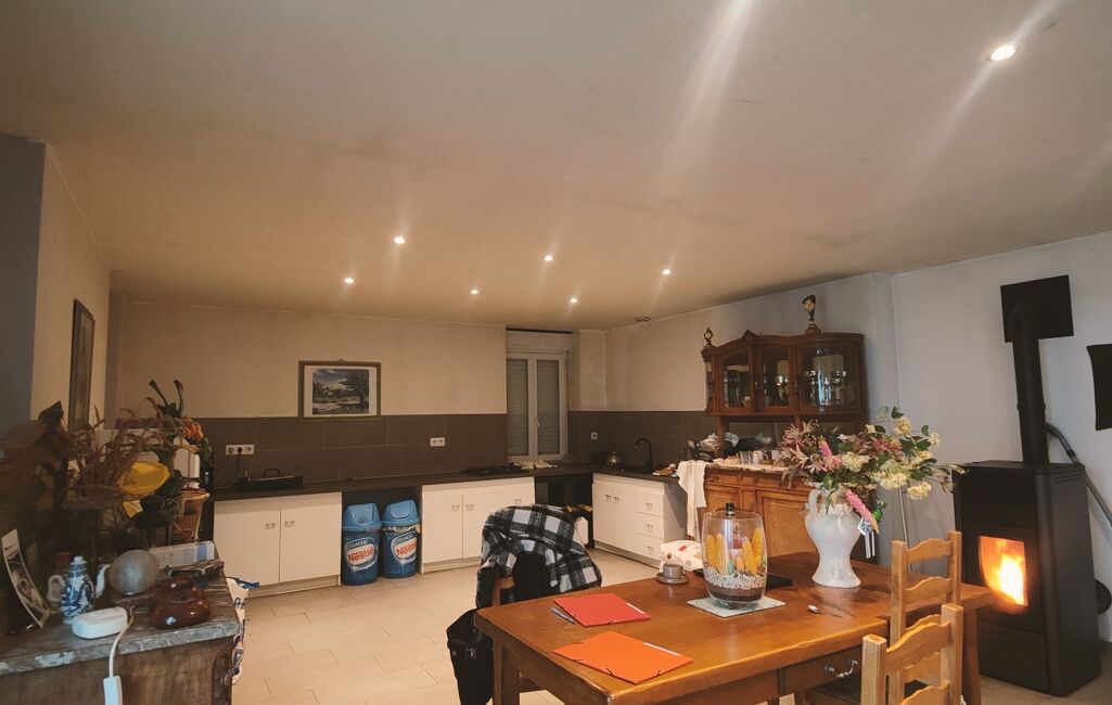 Le rez-de-chaussée offre un spacieux espace de vie composé d'un salon-séjour de 40m² ouvert sur la cuisine, le tout chauffé par un poêle à granulés. Deux chambres, une salle d'eau (douche, double vasque) ainsi qu'un wc viennent compléter ce rez-de-chaussée
