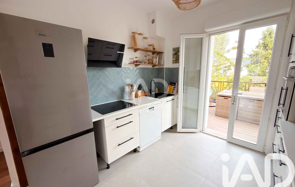 La cuisine ouverte, moderne et équipée, s’ouvre sur une agréable terrasse surélevée donnant sur le jardin.