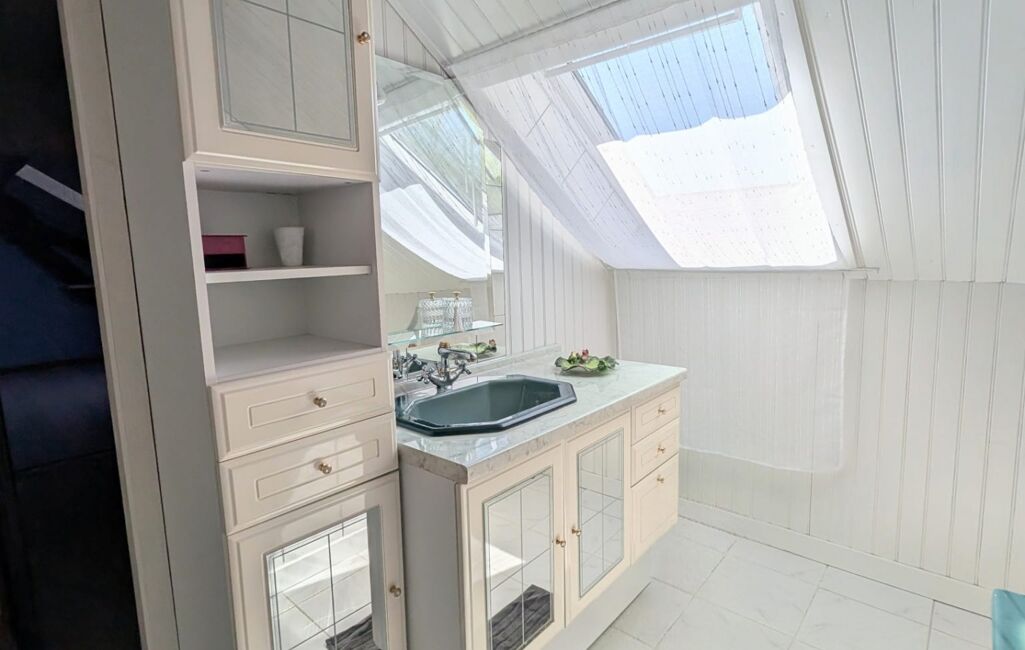 La maison principale, élevée sur deux niveaux avec sous-sol, se compose de 4 chambres, d’un bureau, d’une cuisine aménagée et équipée, ainsi que de pièces de vie spacieuses et lumineuses. Elle dispose également d’une salle de bains, d’une salle d’eau et de deux WC.