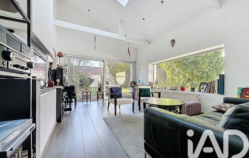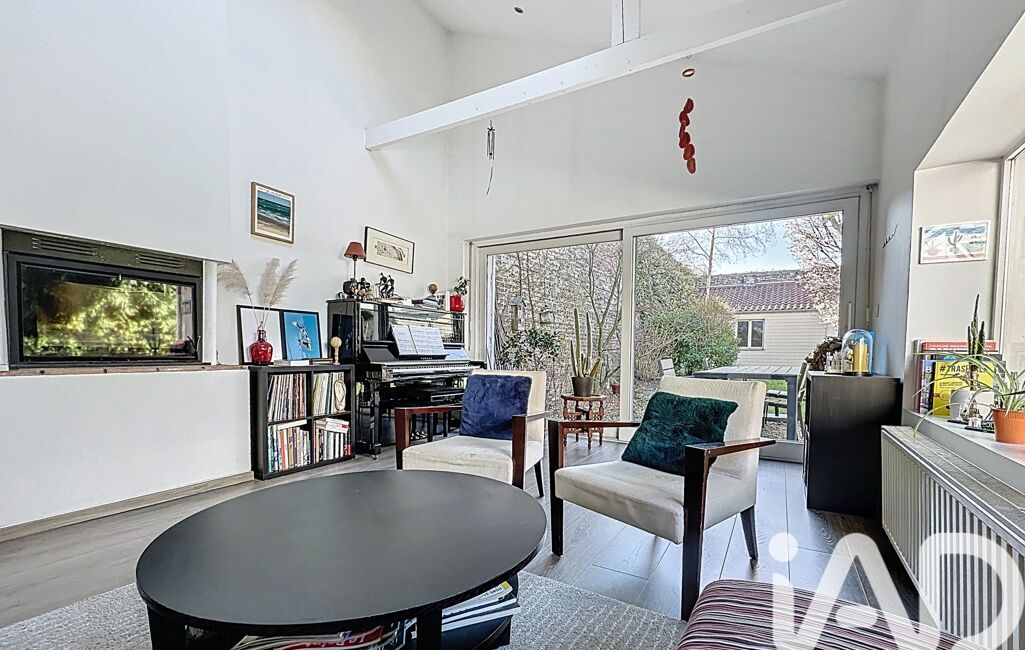 Un salon chaleureux de 21 m² baigné de lumière, doté d'un plafond cathédrale et d'un insert, avec vue directe sur le jardin.