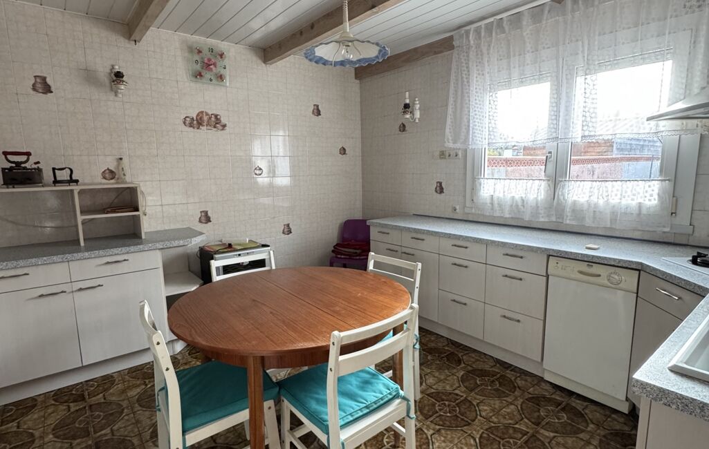 Développant environ 108 m² habitables, la maison offre des volumes confortables et un beau potentiel d’aménagement. Le rez-de-chaussée s’organise autour d’une grande cuisine et d’un espace salle à manger / salon chaleureux avec cheminée à insert, idéal pour les moments en famille. Ce niveau dispose également d’un cellier, d’un WC indépendant et d’un garage.