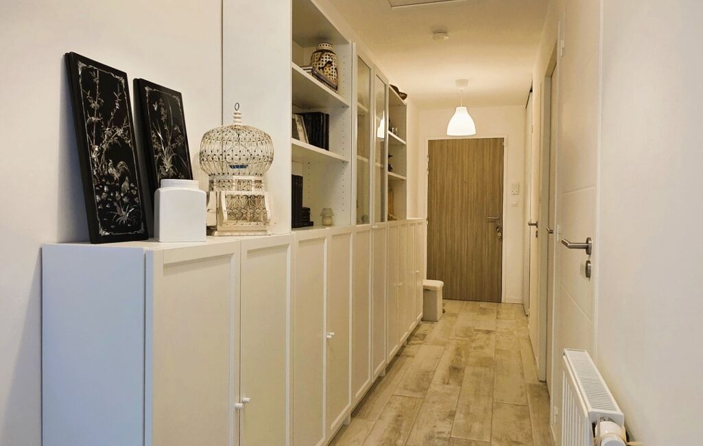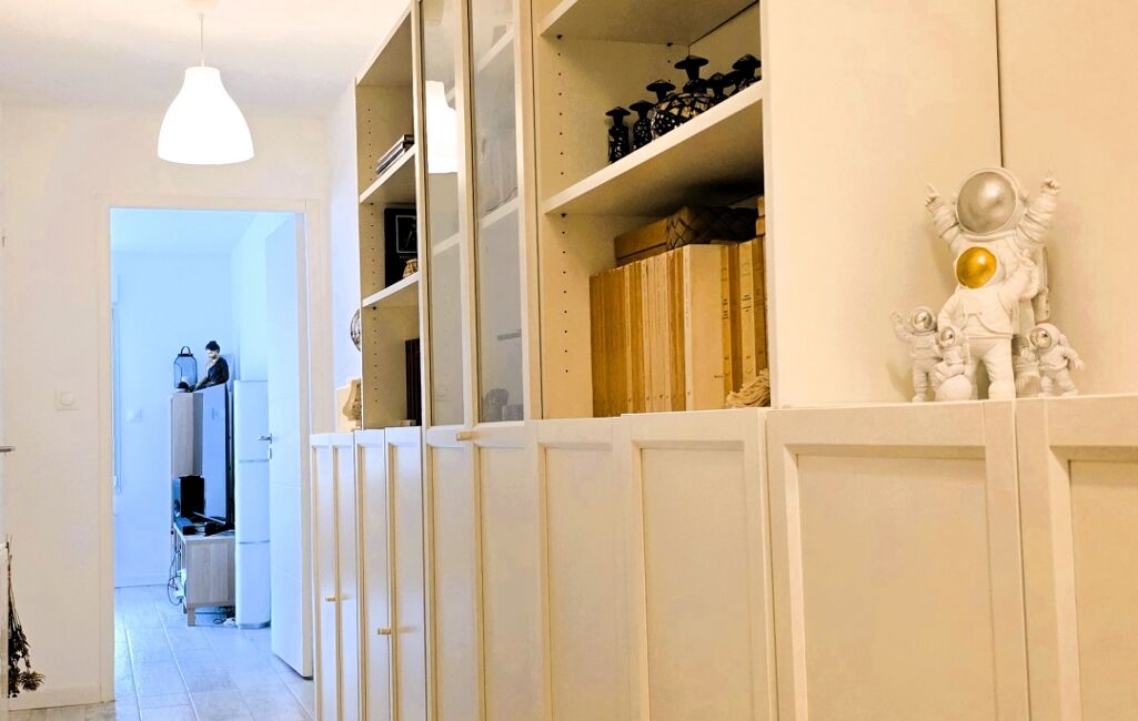 L’appartement se compose d’une entrée avec couloir desservant l’ensemble des pièces, cet espace étant aménagé avec des rangements.