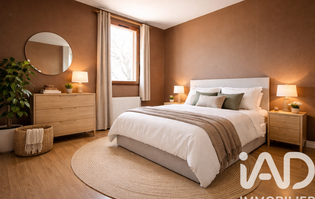 À l’étage, la maison dispose de trois chambres, dont une avec salle d’eau, offrant des volumes équilibrés et adaptés à la vie familiale.