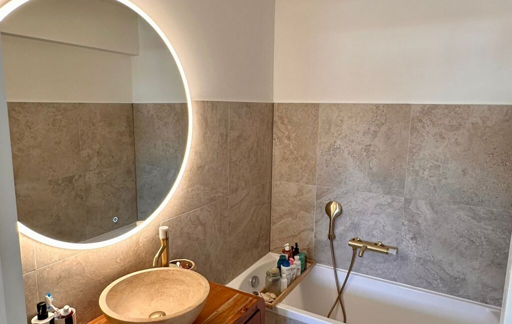The living room, open onto a contemporary kitchen, creates a fluid and welcoming living space. Two bedrooms (10 sqm and 11 sqm), an elegant bathroom, separate WC and ample storage complete the layout. The property has been fully renovated in a refined, modern style.